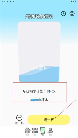 4、在喝水记录页面,点击【喝一杯】按钮,记录当日饮水情况,助力完成【今日喝水计划:8杯水】的目标。