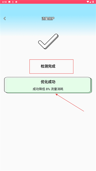 2、检测完成后,系统显示【优化成功】,可降低8%的流量消耗,完成流量保护的优化操作。