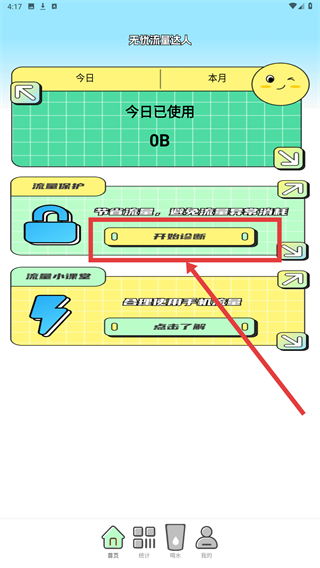 1、在流量管理页面,点击【开始检测】按钮,启动流量保护的检测流程,可优化流量消耗情况。