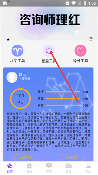 1、在首页点击【星盘工具】选项,进入测星盘的功能页面,该页面展示星盘图表及相关功能选项。