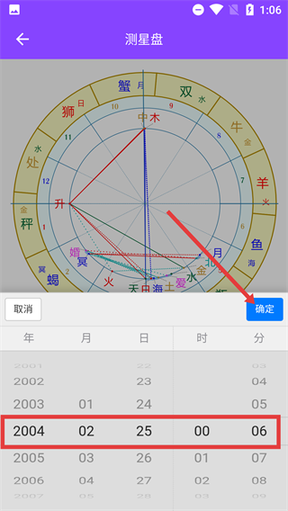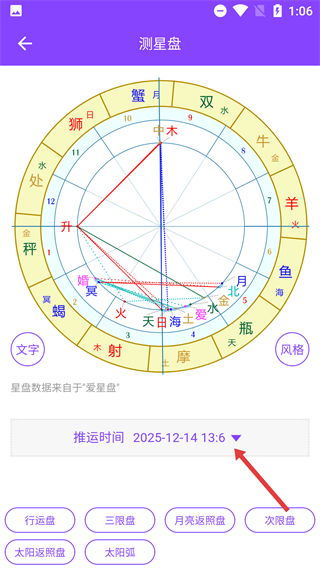 2、在测星盘页面点击【推运时间】区域,打开时间选择的操作界面,准备调整推运的时间参数。