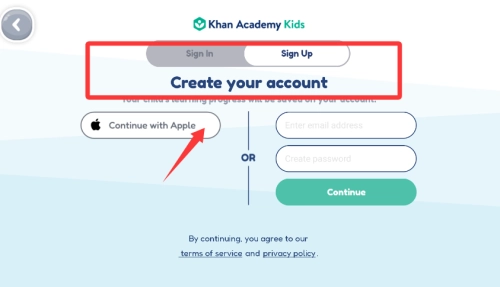 1、并打开可汗儿童学院,家长先为孩子创建个人档案,并选择适合的年龄段,系统会自动推荐初始的学习内容。