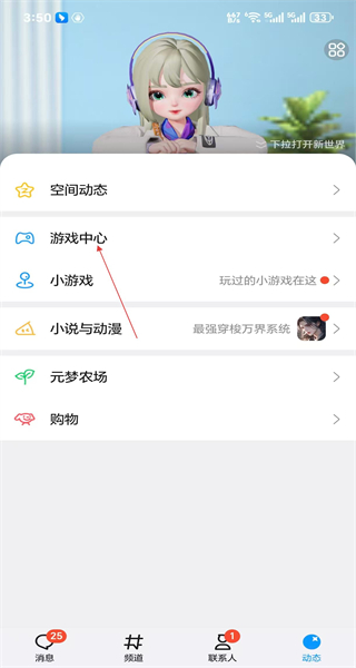 打开软件后,进入动态页面,能看到空间动态等功能入口,接着点击游戏中心选项,即可进入游戏相关页面。