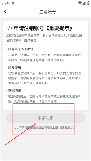 4、在【注销账号】页面,需先阅读【申请注销账号-《重要提示》】,勾选同意后才能点击【申请注销】按钮操作。