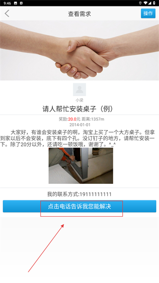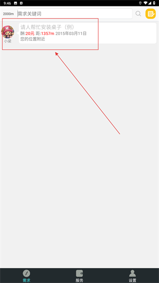 1、在需求列表,查看【请人帮忙安装桌子(例)】类需求,可获取附近的服务需求信息。