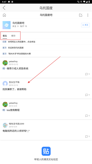 4、在【乌托国度吧】,通过【看贴】标签浏览帖子,获取社区内的信息与资源。