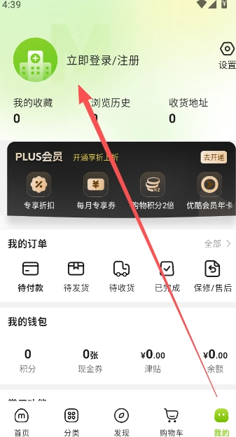 1、进入软件内部以后,选择我的页面点立即登录/注册。
