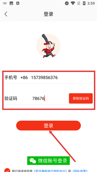 2、进入登录界面,填写手机号码并获取、输入验证码,勾选相关协议后,点击【登录】按钮以完成账号登录操作。