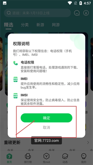 1、当出现【权限说明】弹窗时,该弹窗会说明需要获取【电话权限】【IMEI】【IMSI】等信息,此时点击【确定】按钮即可完成授权操作。