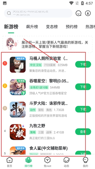 3、进入【排行榜】页面后,【新游榜】会呈现前一日上架或更新的高人气新游戏,可查看各游戏的相关信息以及对应的操作按钮。