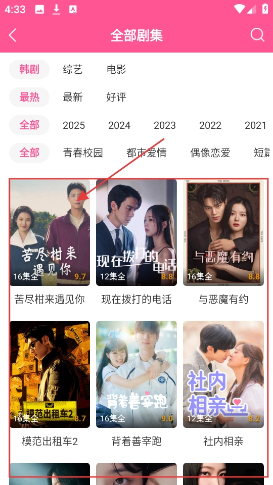 2、进入片库后,能看到各种分类的剧集,像韩剧、综艺等,可挑选喜欢的剧集类型哟。
