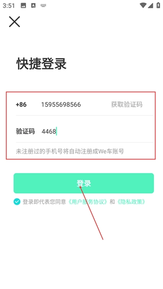 3、在【快捷登录】界面,填写手机号码,点击“获取验证码”并输入收到的验证码,未注册的手机号会自动完成注册。