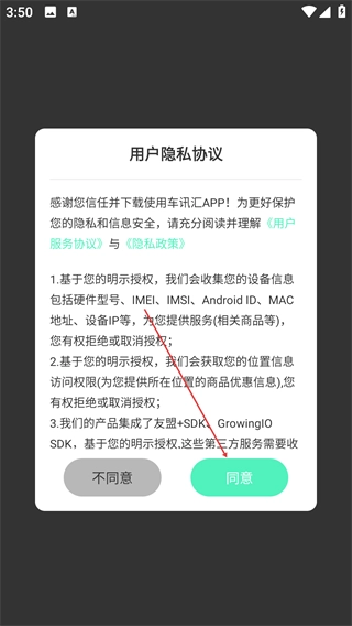 1、打开车讯汇后,会弹出【用户隐私协议】提示,阅读《用户服务协议》与《隐私政策》后,点击【同意】按钮以继续使用应用。