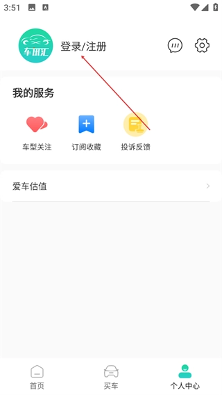 2、进入“个人中心”页面,点击顶部【登录/注册】区域,可进入登录相关界面,同时可查看“车型关注”“爱车估值”等功能入口。