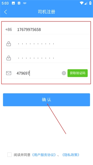 4、在司机注册页填写手机号、密码、验证码,勾选协议后点击【确认】,完成司机账号的注册操作。