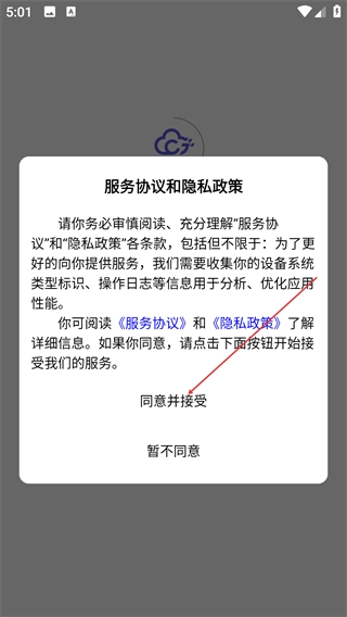 1、先阅读【服务协议】和【隐私政策】,了解信息收集规则后,点击【同意并接受】以继续使用服务,也可选【暂不同意】。