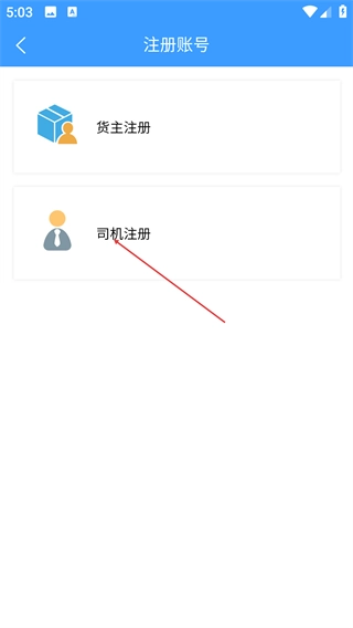 3、进入注册账号页,根据身份选择【货主注册】或【司机注册】,点击对应选项进入相应的注册流程。