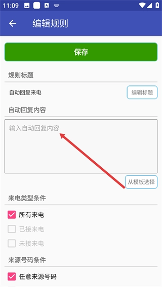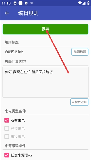 4、填写完回复内容并设置好来电条件后,点击顶部的【保存】按钮,即可启用该自动回复规则。