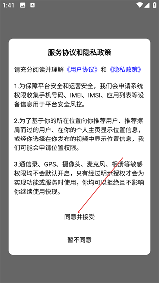 1、阅读【服务协议和隐私政策】后,点击【同意并接受】按钮,即可继续使用应用,也可选择【暂不同意】放弃。