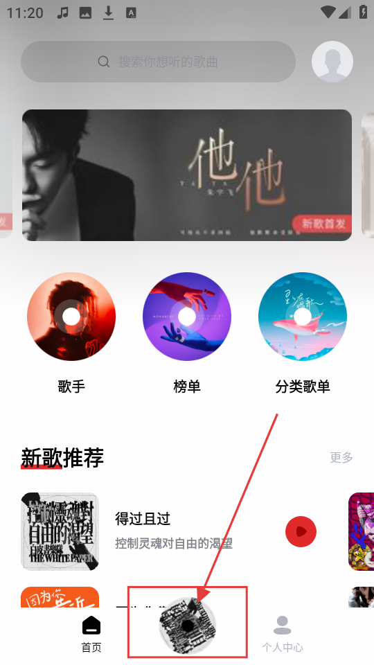 1、进入首页后,在新歌推荐板块挑选一首想聆听的歌曲,例如《得过且过》,点击播放键,即可开启歌曲播放。