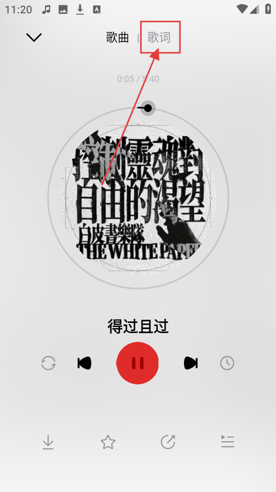 3、进入歌曲播放详情页面后,点击【歌词】选项,即可切换至歌词显示界面,查看该歌曲的歌词。