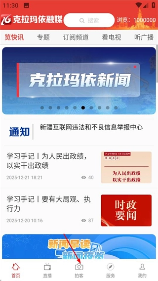 1、在克拉玛依融媒体中心首页点击拍客选项,进入拍客页面。