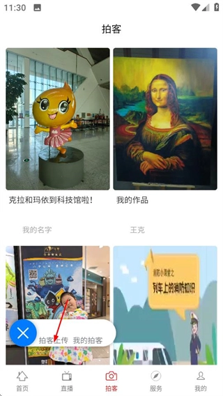 2、在拍客页面点击加号按钮,弹出拍客上传我的拍客选项。