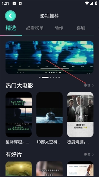 2、进入【影视推荐】页面后,可切换【精选】【必看榜单】等分类,点击【热门大电影】右侧的【更多】查看完整片单。