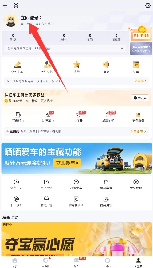 1、启动懂车帝二手车后,进入个人中心页面,点击左上角登录按钮完成账号绑定。