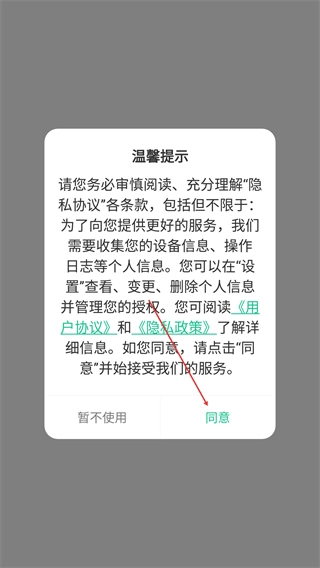 1、打开应用后弹出【温馨提示】,阅读《用户协议》《隐私政策》后,点击【同意】按钮以继续使用服务。