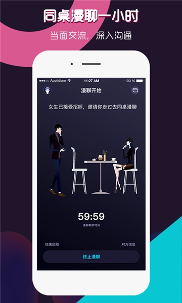 电磁波圈:到达邂逅点后,若无承重墙遮挡,以用户为圆心,半径18米范围内的所有在线异性用户均可被准确发现(在电磁波圈上女生显示为红点,男生为蓝点)。男生点开红点,可以看到女生的今日穿着。在18米的可视范围内,男生可以直接根据衣着信息找到红点显示的女生,如果符合心意,则可以向女生送出玫瑰花。