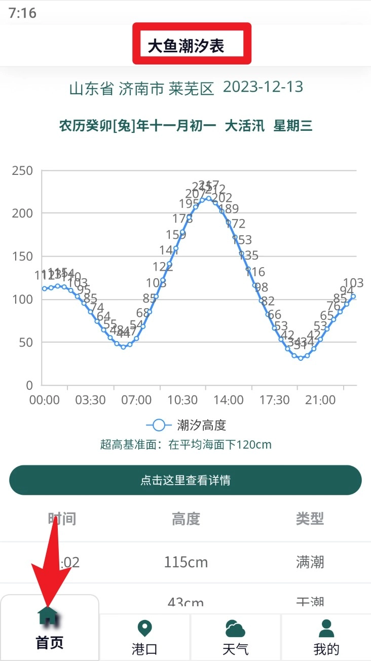 在首页能够查看当日的潮汐高度曲线以及涨落时段,其中包含了详细的潮汐图、对应的时间点和高度变化情况。