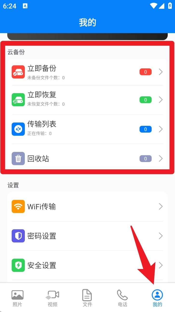 回到页面底部的导航栏,点击“我的”选项,就能开启云备份功能,进行数据恢复操作,还可以查看传输记录和回收站内容。
