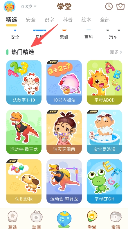 1、面向0-3岁儿童设学堂板块,含精选安全识字等分类,热门精选覆盖数字字母习惯等多类启蒙内容。