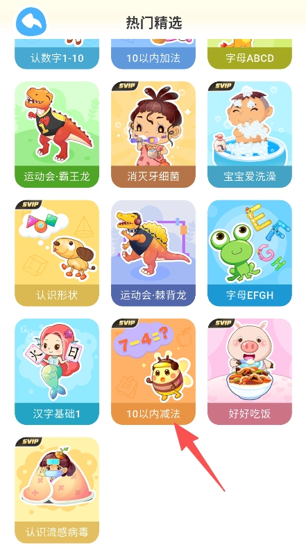 2、可点击热门精选中的目标内容,如10以内减法,进入该内容对应的启蒙学习页面。