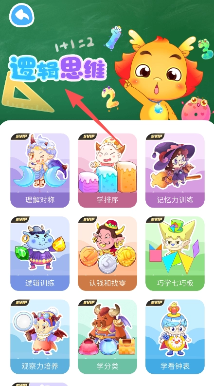 3、设逻辑思维板块,含理解对称学排序等训练项目,以卡通形象呈现各类学习内容。