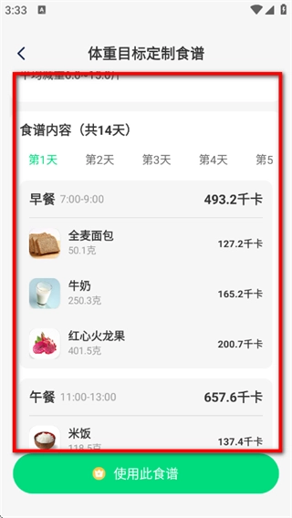 4、在体重目标定制食谱的详情页面中,能够查看14天内每一天的食谱内容。