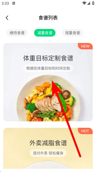 3、在减重食谱分类页面,挑选以体重目标为依据定制的食谱,然后进入该食谱的详情页面。
