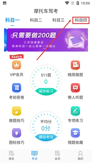 在【摩托车驾考】界面中,点击顶部的【科目四】选项卡,即可切换到科目四练习板块。