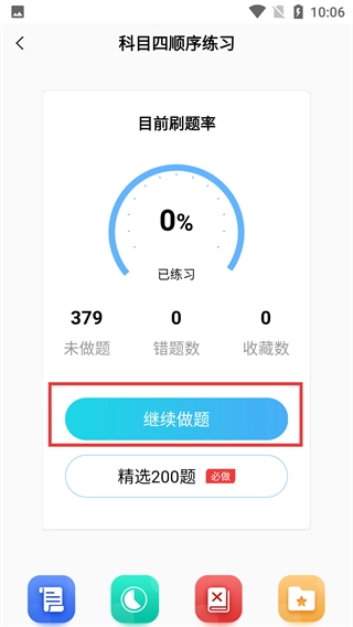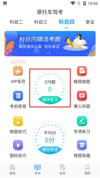 进入【科目四】板块后,能看到有【379题】等待练习,点击【顺序练习】按钮,就能开启科目四的练习流程。