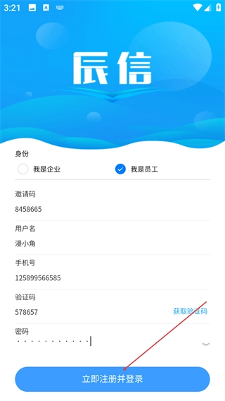 3、进入注册界面后,首先选择对应的身份(例如【我是员工】),接着依次填写邀请码、用户名和手机号,随后获取并输入验证码,设置好密码后,点击【立即注册并登录】按钮即可。