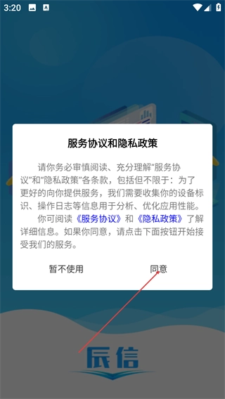 打开应用后,会弹出【服务协议和隐私政策】的提示窗口,在仔细阅读相关条款内容后,点击窗口中的【同意】按钮,就能进入到应用的登录相关界面了。