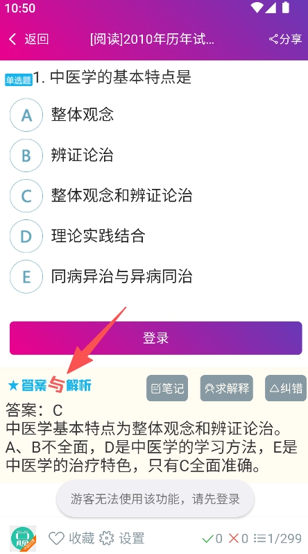 3、部分功能需登录使用,同时提供笔记求解释纠错等辅助备考的工具选项。