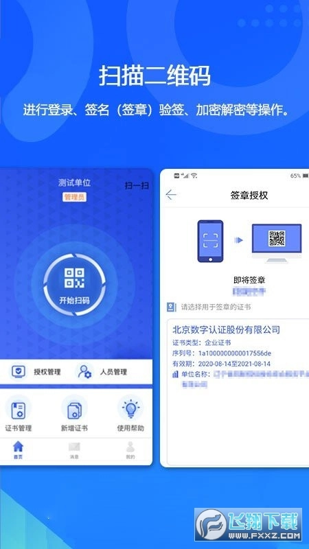 移动数字证书支持一部手机申请多张CA证书,且多张证书之间能无缝兼容,通过扫描二维码即可完成登录、签名(签章)、验签、加密解密等操作。