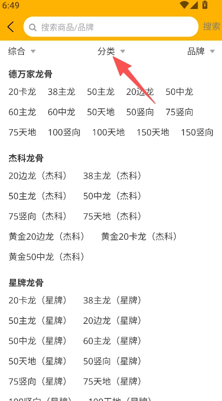 2、支持按品类分类浏览产品,例如龙骨类品类下可查看不同品牌、不同型号的具体产品信息。