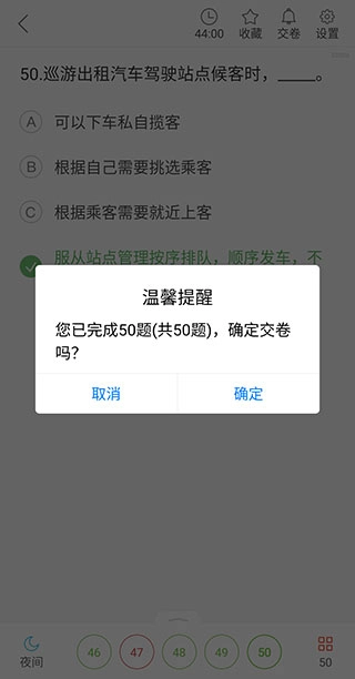 完成所有题目后,系统会弹出交卷提示框,点击【确定】按钮就能完成交卷操作。