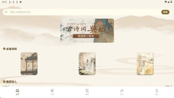 1、安装完成后进入的首页,呈现了必备诗词内容,支持搜索功能。