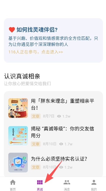 1、打开真诚相亲,点击“真诚”进入对应板块。
