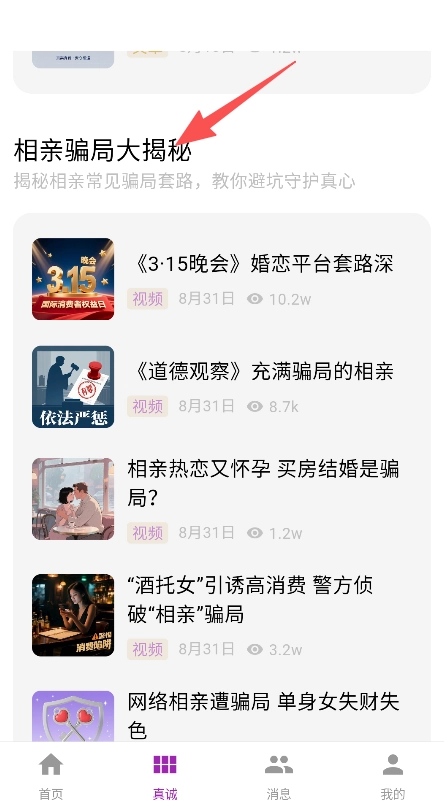 2、在真诚板块中找到相亲骗局大揭秘相关内容。