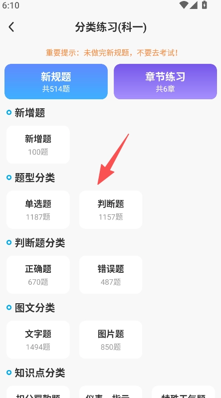 2、分类练习进一步细化为新规题和章节练习两大板块,并且题型也按类别进行了划分,这样的设置更方便考生开展具有针对性的驾考练习。